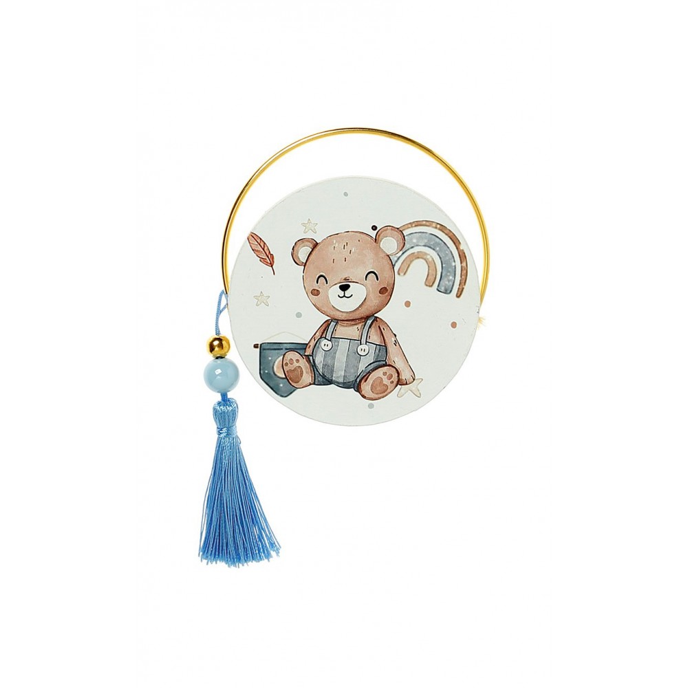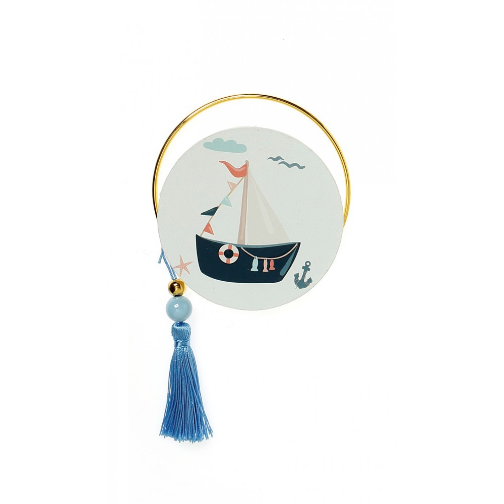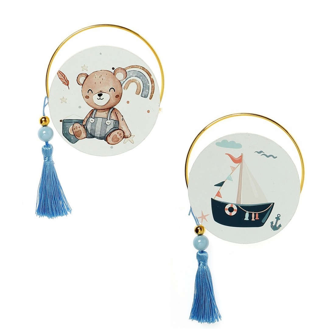 Μπομπονιέρα στρογγυλό εκτυπωμένο ξύλο και χρυσό στεφανάκι με Θέμα Αρκουδάκι ή Καράβι.